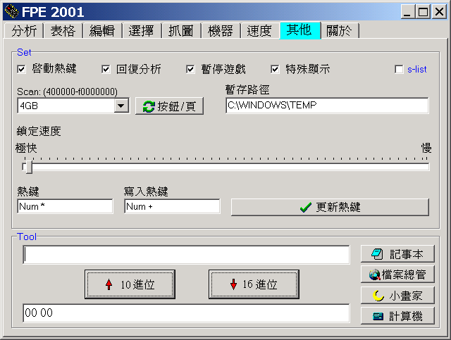 好,现在换个修改器看看,用FPE,我这里用FPE2001,先把设置里面的搜索范围调大点提高成功率,切换前最好先F2暂停游戏,我是选择全部的4GB,先进游戏,现在金属是1000,切换出游戏,这里我是按alt+Tab切换的,在fpe里输入1000.,搜索,从FPE弹出的界面里选择TA游戏的执行文件,然后alt+TAb切换回游戏,等金属存留量变动比如这里是2000,切到FPE,输入2000.,反复如此,直到得到结果,我最后得到了两个地址,下面尝试修改。