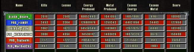 开局三组战队分别出生在三个小岛上(.cmdwarp),对战形势是PLU(白色+紫色)VS PRD(红色+蓝色)VS BL4CK(绿色+灰色).开局有轰炸的骚扰的,有做防御的,接着每个战队不约而同地都造了好几个运输机,把工程车运到中间大陆去抢地盘.