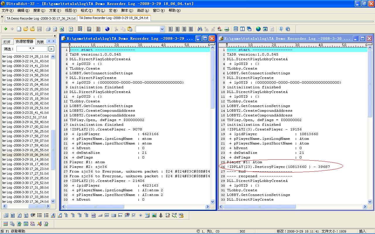 比对了log文档,发现联机失败的时候记录为直接DestroyPlayer,下面是联机成功与失败时的log文件比对