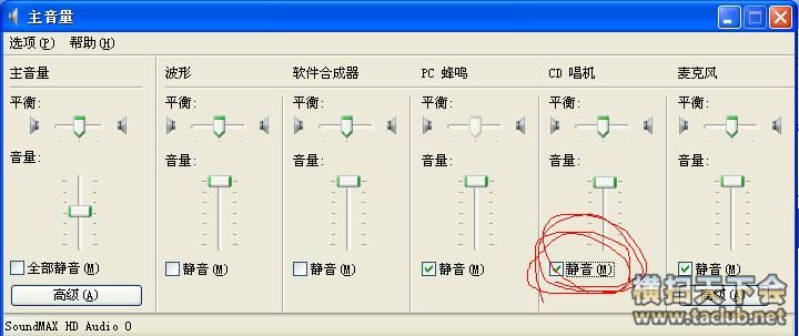 突然想起来,以前学习COOLEDIT录歌的时候,曾经改了系统音量的设置,把“CD唱机”勾上静音了,既然TA用的是CD音轨,可能会有影响(如图)